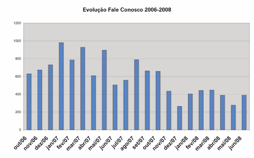Atendimento Nova Sede Para atender à demanda por informação surgida em função da construção do edifício da nova sede do TJMG, foram criados quatro canais de atendimento específicos: telefone 0800, em funcionamento desde julho de 2008; e-mail; formulário impresso de perguntas, disponibilizado no local da obra; e formulário eletrônico de envio de mensagens, disponibilizado no Portal. Através desses canais, o público pode solicitar esclarecimentos, enviar dúvidas, reclamações e elogios relativos à obra. Com isso, é possível manter a comunidade informada, buscando reduzir o impacto causado na implantação do empreendimento. Fale Conosco São respondidos, em média, 20 e-mails por dia, enviados à Ascom pelo link Fale Conosco no Portal TJMG. Questionamentos variados, elogios, críticas e sugestões são encaminhados por diversas pessoas, incluindo profissionais da área do Direito, estudantes e cidadãos em geral. No período de outubro de 2006 a junho de 2008, o Fale Conosco atendeu a 12.452 e-mails. Até dezembro de 2007, o atendimento das demandas externas e internas era feito por um único e-mail (ascom@tjmg.gov.br). Com a criação do endereço faleconosco@tjmg.gov.br, as solicitações direcionadas aos setores internos da Comunicação foram separadas das demandas recebidas por meio do link do Fale Conosco, que atende principalmente o público externo.