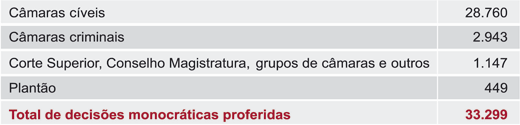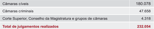 Entre outubro de 2006 e junho de 2008, os órgãos colegiados do TJMG realizaram 232.054 julgamentos, sendo que 77,6% deles foram realizados nas câmaras cíveis e 20,5% nas criminais. No mesmo período, foram proferidas 33.299 decisões monocráticas. Julgamentos realizados pelos órgãos colegiados